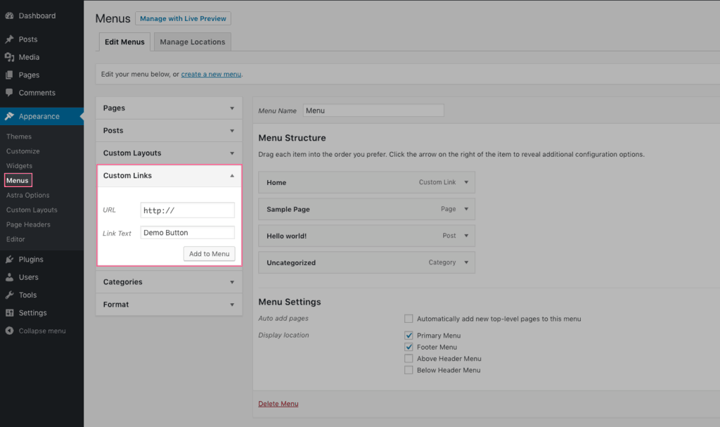 Cách 1: Astra Customize (chức năng của theme Astra)